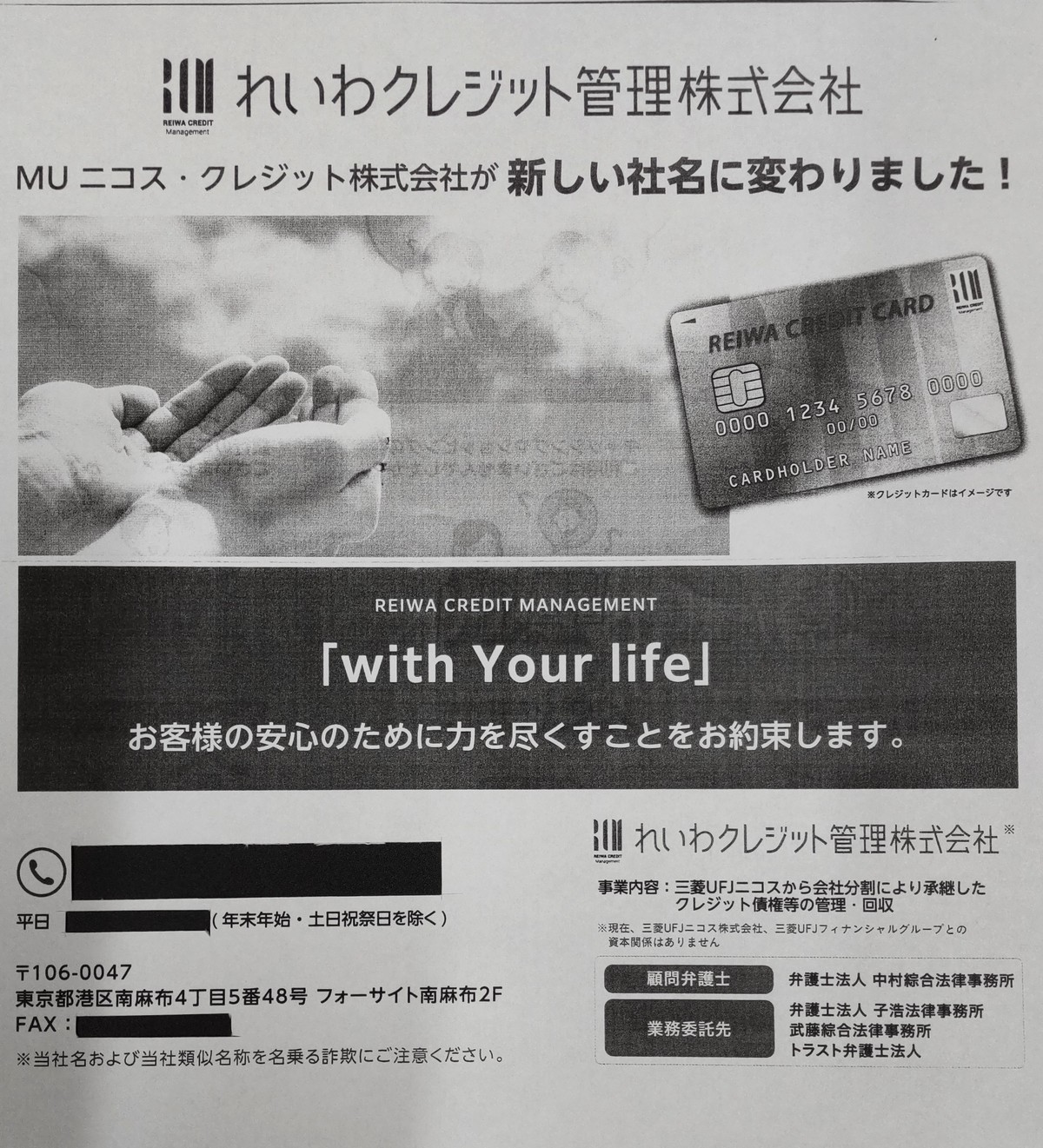 ・れいわクレジット管理とは、三菱UFJニコスから会社分割によってクレジット債権の一部を承継したMUニコスクレジットが社名変更した会社なので、請求を無視してはいけない。